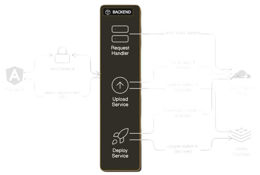 Under the hood, Jett is powered by a microservice architecture. The Angular 20 frontend runs with server-side rendering for speed, while the Express middleware manages authentication and routing. Cloudflare R2 handles object storage for deployment assets, and Redis provides real-time tracking of deployment states. All services are containerized with Docker and hosted on Render, keeping them isolated, secure, and independently scalable.